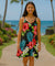 This is a beautiful soft rayon thin straps girls dress with V-Neck pull over scarf hem and adjustable tie string with keyhole back and island flowers in black, white and teal colors made in Hawaii. Sizes 2-14.