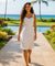 This short sarong dress in soft rayon features adjustable straps, a sweetheart neckline, and a front wrap side tie. Complete with an invisible zipper and smocked back, it’s available in white, sizes S to 2XL. Made in Hawaii, USA.