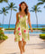 Short Hawaiian dress with a relaxed waist, V-neckline, and sleeveless bodice. Made from soft rayon, it features a keyhole back with adjustable tie and a flowing handkerchief hem. Made in Hawaii.